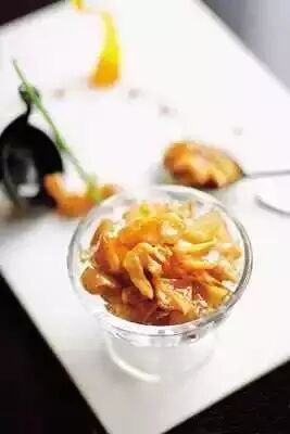 此菜用鸭心、鸭肝酱卤入味,再制作成冻,小巧可爱,一口咽下一个,非常利于食用。水晶鱼冻是最近新出的一种制冻料,不添加任何添加剂,呈固体状,将其融化后,加入原料再放凉成冻即可,使用非常方便。