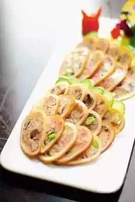 这款带馅鲜鱿凉菜在原先的基础上,在馅心里加入凤爪,胶质粘度更大,蒸完再熏制成菜,其表皮也会附有烟熏香气,食用起来风味更佳。