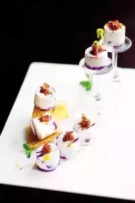 此豆腐制作比较讲究,可以提前预置,其造型非常独特,视觉冲击力很强,可谓中西结合,用豆浆、嫩豆腐结合芝士、意大利明胶片烹制,口感、口味都非常新颖。