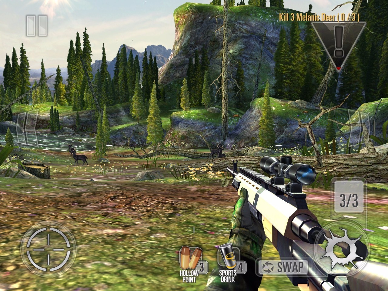 画面真的很精美,有各种各样的猎物:洛杉矶山羊、XX大角羊、XX驼鹿、美洲豹、白狮、黑熊……总之认识了不少物种。动画也很逼真,最后一击有子弹射出的慢镜头,猎物被射中倒地的动作。温馨提示:惊动动物之后,食草动物会逃跑,捕食者会向你冲过来,所以要在食草动物跑完或者捕食者杀掉你之前完成任务,不然就GG了。