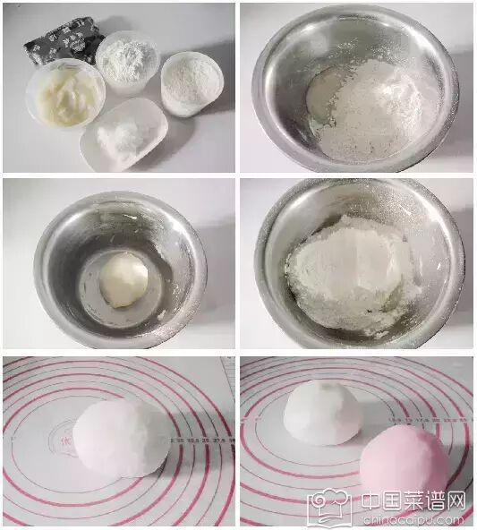 油皮:中筋面粉 125克 ,糖 15克 ,猪油 20克 ,水 62克 。色素几滴
