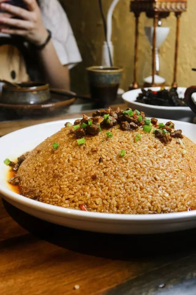 宛如一顶蓑帽的金黄色锅巴倒扣在盘中,将勾好芡的汤汁均匀的浇在金黄诱人的锅巴上,轻轻破开一角伴随着那滋啦的响声,又脆又香的锅巴与汁水的香味填满鼻腔,口感酥脆微辣、甚是诱人。