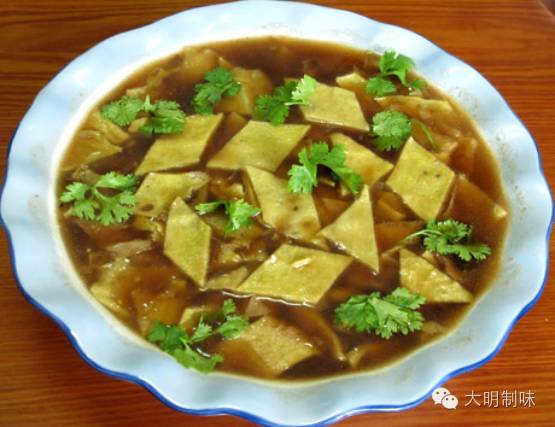 乍一听咯扎这个名字,很多没吃过的人,还以为是糊铬渣,也就是锅巴。其实一点不沾,咯扎最早是唐山遵化马兰峪那边的人发明的,那里山坡子地多,盛产绿豆。人们把绿豆磨成面,搅成浆糊状,用尖锅摊成圆形薄片,一张咯扎就做成了。出锅香气扑鼻,韧劲儿十足,拎起来不会破,折起来也没裂纹。虽然这咯扎原料做法都没啥稀奇,名字起得也少了几分雅致,当地老百姓逢年过年、婚丧嫁娶、迎来送往,那都是必不可少,而且,这唐山的咯扎还是给皇家进贡的贡品呢。