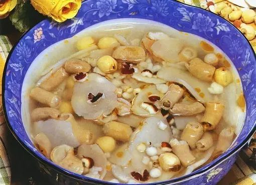 功效:萝卜性凉味辛甘,能消积滞、化痰热,下气、宽中;莲子性平味涩,能健脾胃、养心神;芡实性平味甘淡,能补脾止泻;蜜枣性平味甘,具益气生津、滋润肺胃的作用;猪舌能补益气血、滋补强壮;猪骨补血生髓、强筋壮骨。合而为汤,则清润滋补、宽中下气,可除春寒祛湿困。