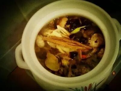 材料:乌骨鸡、白凤尾菇或猴头菇、黄酒、姜、葱
