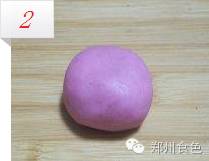 火龙果皮榨汁、澄粉开水烫熟,加糯米粉和糖粉混合,和成粉色面团,醒半个小时,我用的是上次剩下的面团做的,取30克左右面团,手心拍扁包人馅料收口