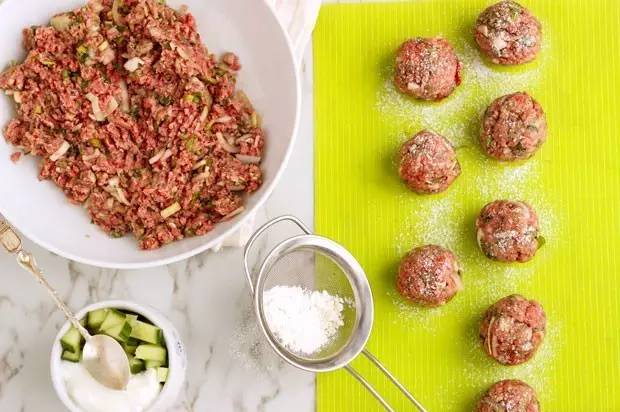 材 料 碎牛肉300g、食用油20g(用于煎肉丸);拌肉用料:玉米淀粉20克、盐3克、酱油1/2勺、芝麻油1/2勺、姜、蒜末10g、芹菜10g、香菜香葱10g、温水30g、鸡蛋1个、黄瓜切碎30g。
