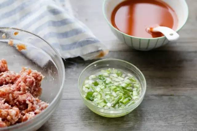 1、将碎猪肉、玉米淀粉、盐、酱油、芝麻油、切碎的洋葱、蒜末、生姜、温水倒入一个碗中搅拌。