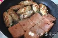 6、五花肉煎制两面金黄后,盛出来备用。鸡翅翻面划到一边就可以煎午餐肉了,毕竟鸡翅需要一点时间才能熟的。