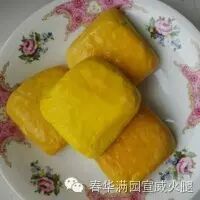 1、这个就是宣威黄豆腐,如果是外省的朋友买不到,那么选择水汽少,质地稍硬,厚实的豆腐也可以