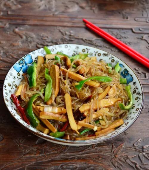 2、炒锅加油烧热,下红椒丝和香干翻炒,加入少许盐、生抽调味,如果太干可加入少许水;
