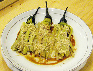 4、把尖椒的中空段用搅拌好的豆腐泥填满,抹平;