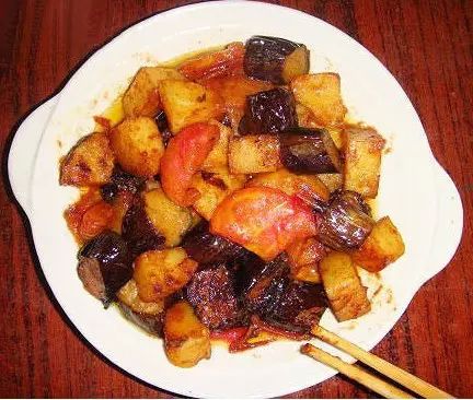 5、煎好茄子后,把西红柿和煎好的土豆一起倒进锅里。然后放入盐,油,胡椒粉,姜粉,十三香,生抽调味,加少许水煮3分钟即可;