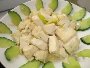 解毒消炎、润燥平胃:豆腐在植物性食物中蛋白含量最高,且其蛋白质很容易被人体消化吸收,是肠胃消化机能降低的人的理想食物。豆腐性寒,含碳水化合物极少,有节制机体和润燥平火作用。搭配性味甘寒的黄瓜,具有清热利尿、解表、解毒、消炎、养肺行津、润燥平胃及清热散血等功效。