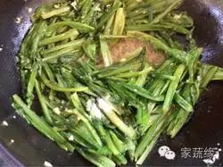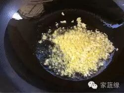 5.关小火倒入蒜蓉煸炒出蒜的香味。