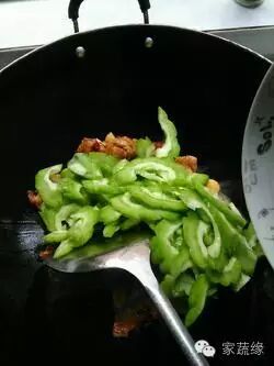 8.把腌制的苦瓜沥干水后,倒入锅抄