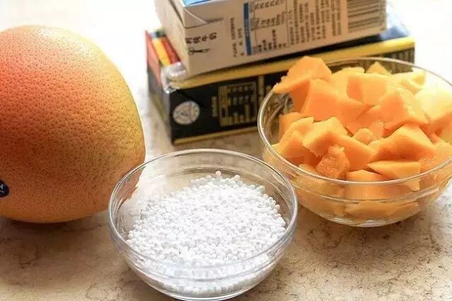 材 料 大芒果2个,去皮去核;柚子半个,去皮,掰开;牛奶200ml;椰奶200ml; 西米40g。