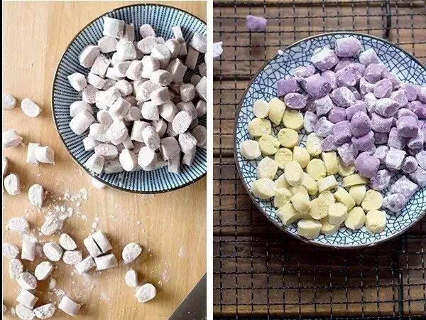 4、最后,将水在锅中烧开,加入芋圆球煮1分钟至膨胀漂浮在水面,红薯的则要多煮一会儿。