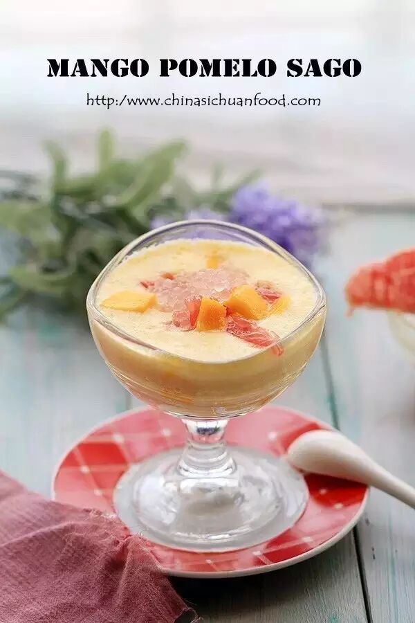 4、将芒果糊倒入碗中,加入煮好的西米,将芒果块和柚子置于顶部。就可以开动了~