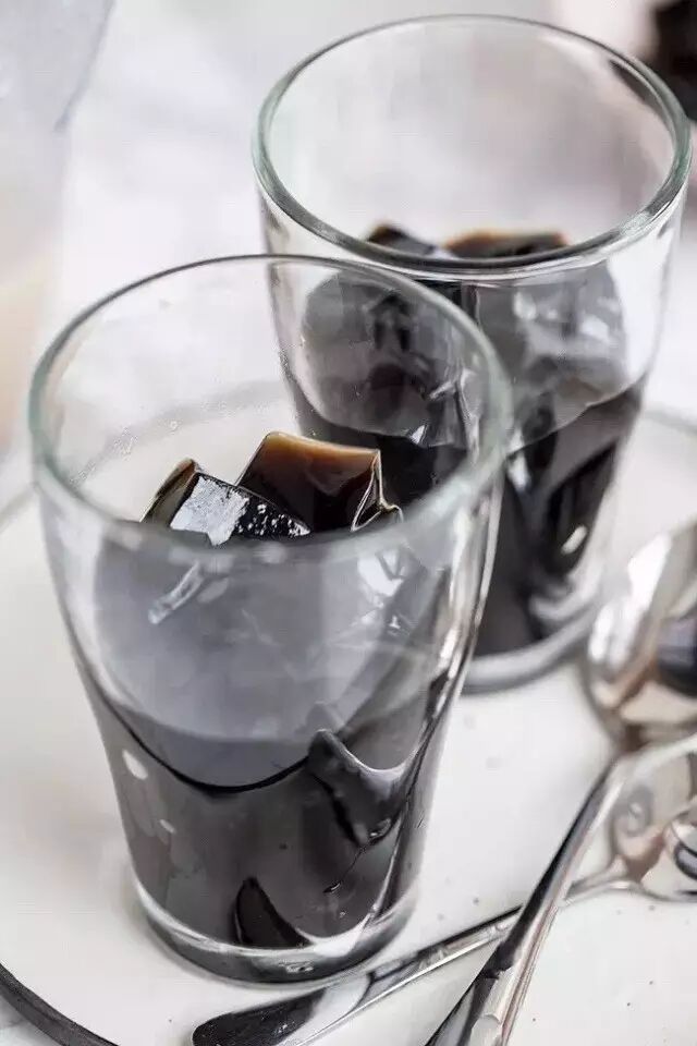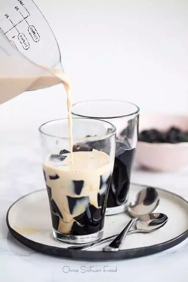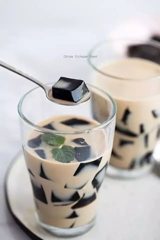 6、或是做烧仙草奶茶。将切块后的烧仙草放入玻璃杯中。