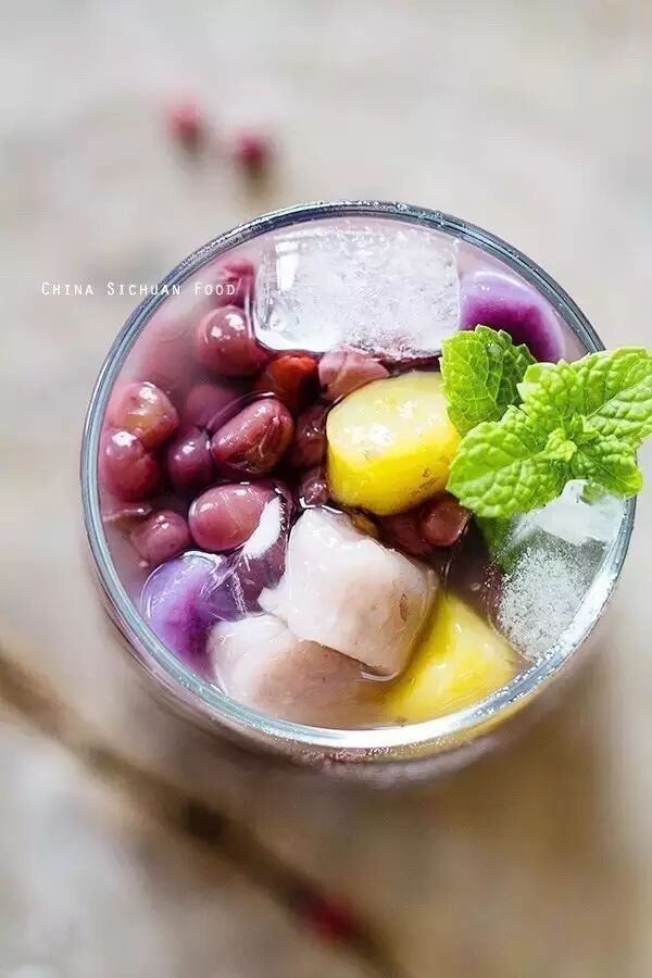5、将冷藏后的红豆汤倒入碗中,然后将煮好的芋圆和薯圆放在顶部,加一点薄荷叶和冰块进行装饰,一碗高颜值的清爽红豆芋圆糖水就做好了。