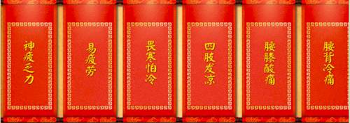 ▲神倦乏力、易疲劳、畏寒怕冷;四肢发凉(膝盖冷、背心冷)、腰膝酸痛、腰背冷痛。