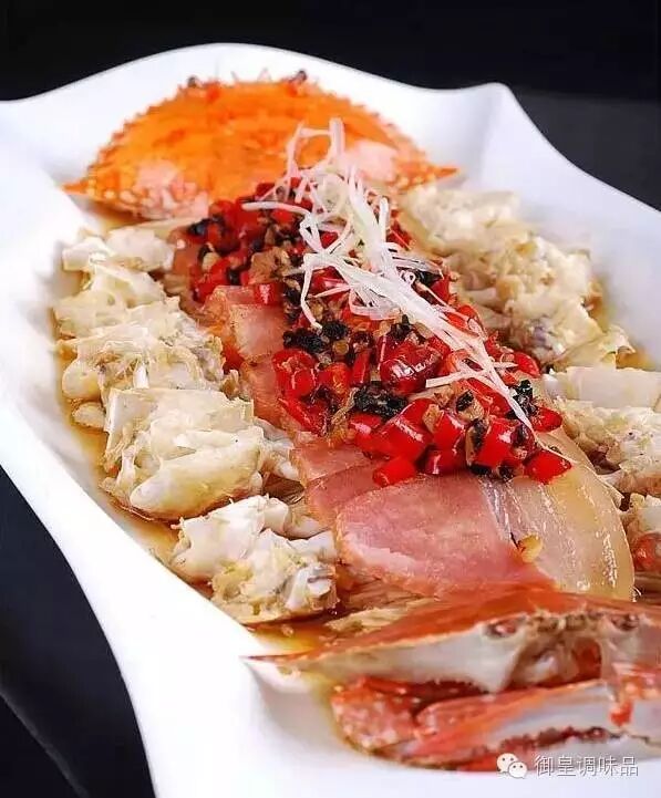 2、取浏阳豆豉和蒜泥撒在盘中肉蟹上,上笼蒸熟后,取出来淋御皇蒸鱼鲜便成菜。