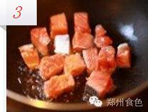 3.锅内抹少量油,加入三文鱼煎制
