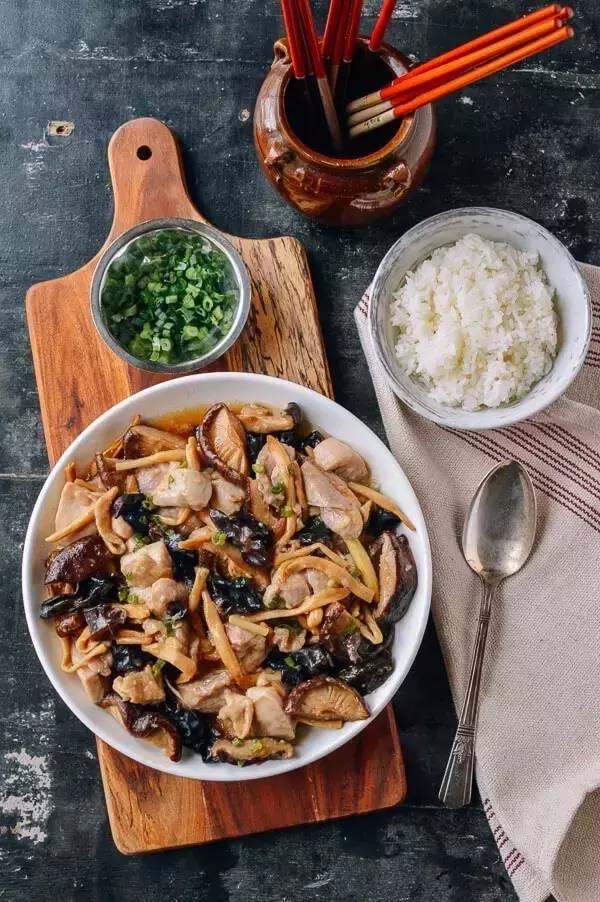 材 料 干木耳40g;金针菜50克;香菇10个,泡发;鸡腿肉1斤,切块;鸡高汤40g;食用油1勺;麻油1/4勺;耗油1勺;白砂糖1/4茶匙;食盐3/4茶匙;胡椒粉1/4茶匙;姜末1/2茶匙;葱花1小撮;玉米粉1勺。