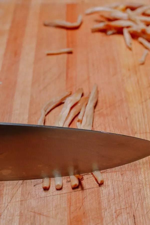 1、打开水龙头冲洗木耳、金针菜、香菇,确保洗净后,将金针菜尾部最硬的一截切掉。再将香菇茎切掉,以加快泡发的速度。