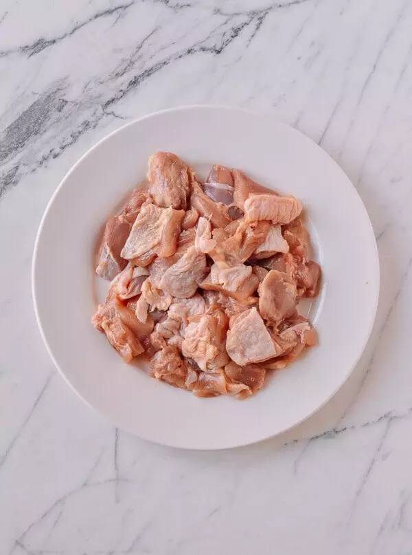 4、然后将浸泡后的香菇、金针菜、木耳倒入鸡肉中,加入玉米粉,搅拌均匀,此时汁水应已被鸡肉充分吸收。