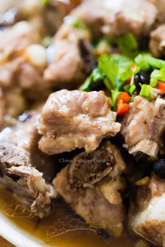 材 料 排骨500g、生姜5克、食盐3克、白砂糖8克、料酒1勺、豆豉1勺、蒜瓣2个;淀粉水用料:玉米粉2勺,水3勺;装饰用料:香菜、红辣椒、香葱各一小段。