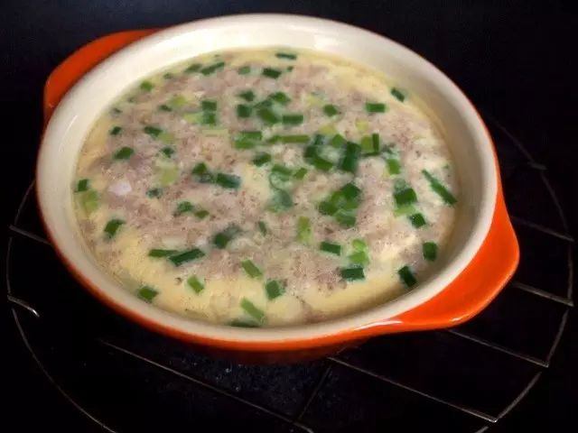 材 料 鸡蛋2个;猪肉末80g;香葱1小撮;麻油1茶匙;腌肉末所需调料:料酒1勺;盐5g;胡椒粉5g;酱油1/2茶匙。