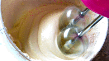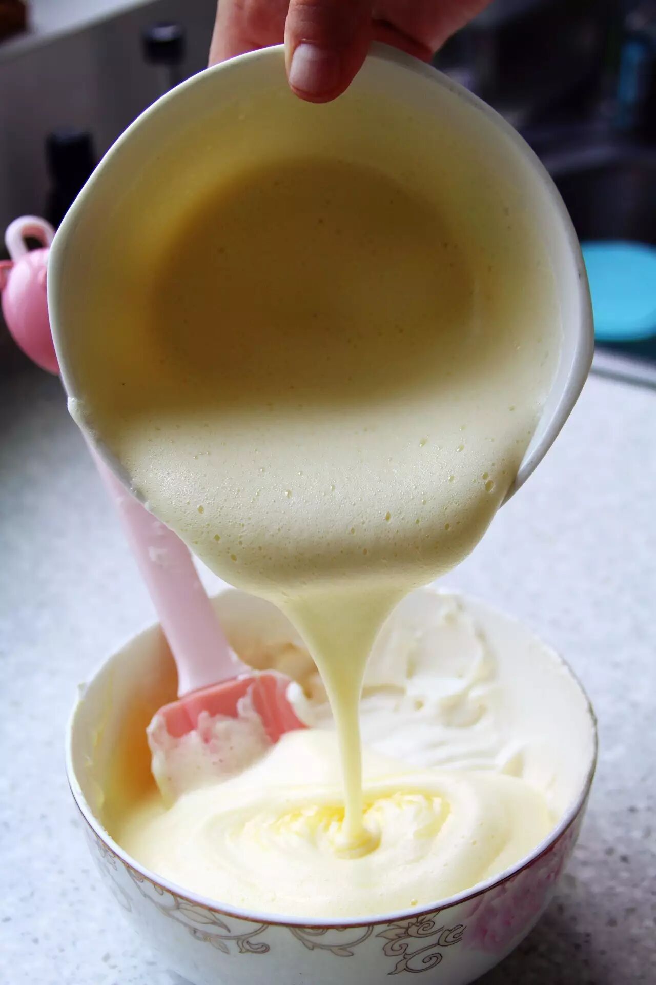 5/12 将打好后的马斯卡彭芝士与蛋黄糊混合拌匀。
