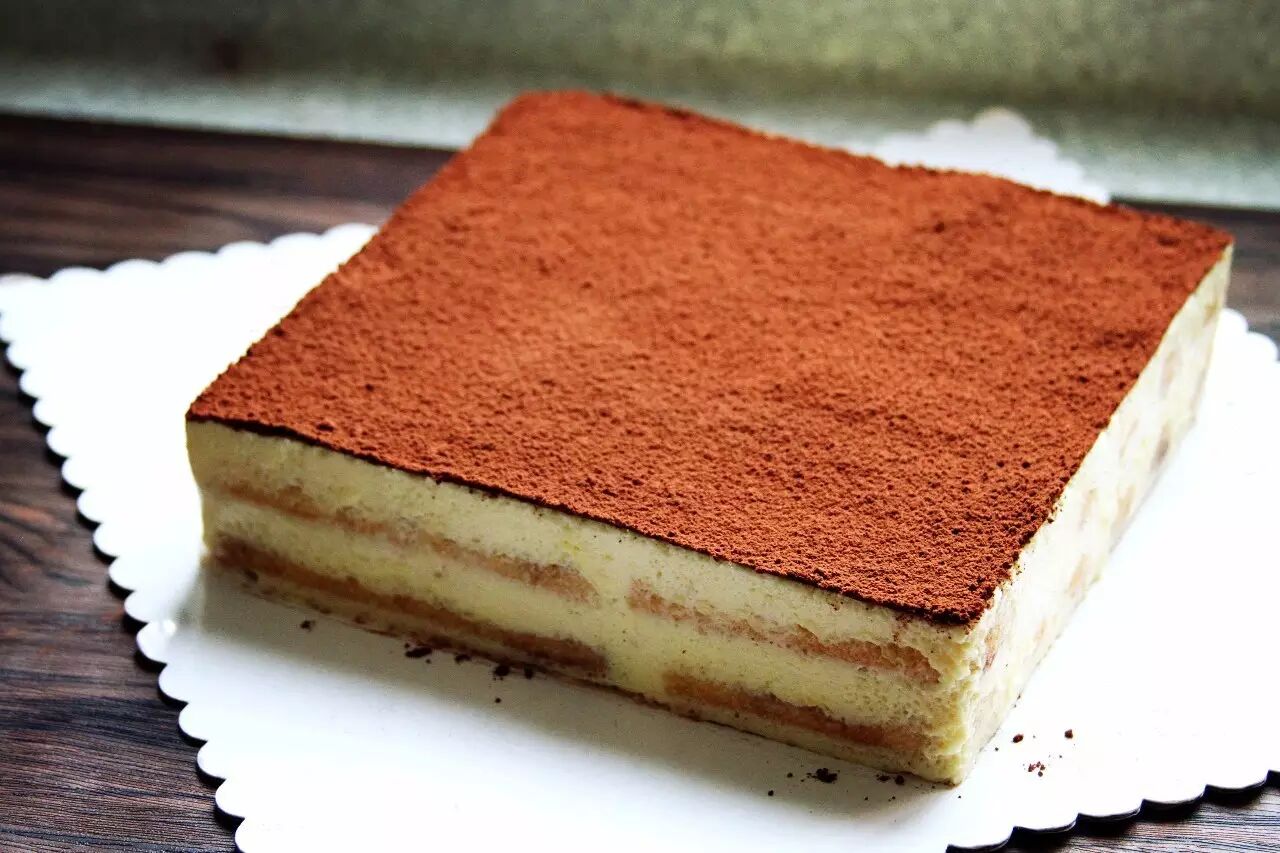 在马斯卡彭芝士糊上继续铺一层蘸了咖啡酒的手指饼,并倒入剩下的一半马斯卡彭芝士糊。把蛋糕放进冰箱,冷藏五到六个小时。