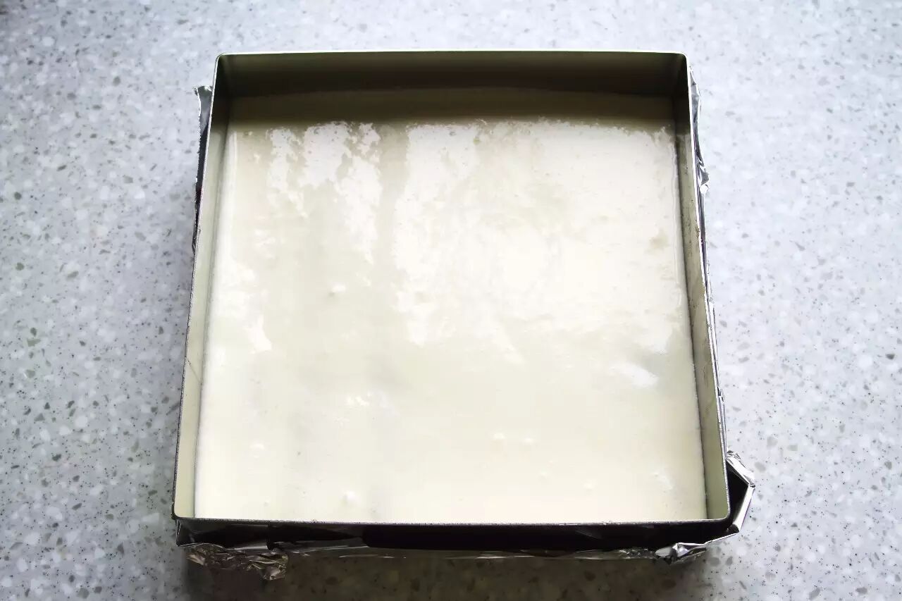 10/12 将蛋糕模底部用锡纸包裹。沾满咖啡酒的手指饼放入蛋糕模底部,直到手指饼铺满整个底部。并倒入一半的马斯卡彭芝士糊。