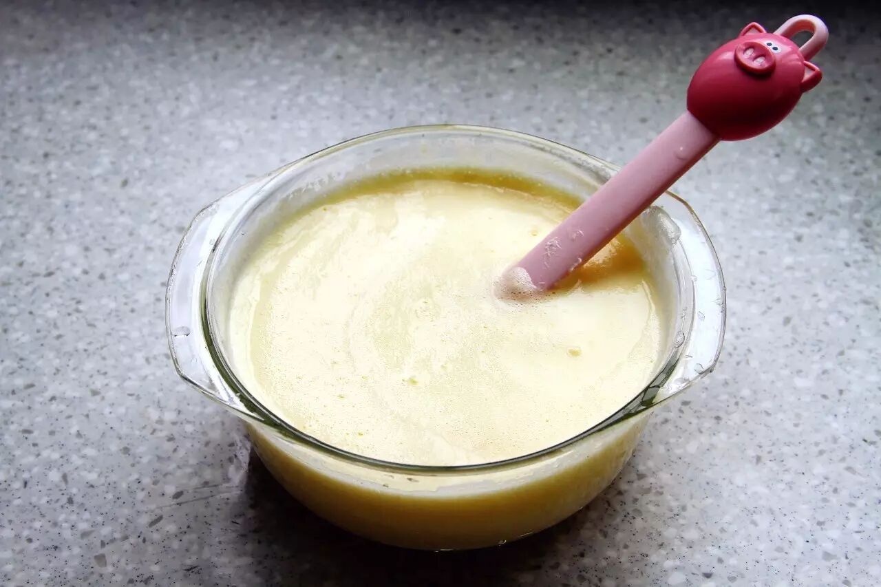 3/12 糖水沸腾后关火。一边用打蛋器搅打,一边缓缓倒入第1步打发好的蛋黄。蛋黄液倒入完毕以后,继续用打蛋器搅打,直至蛋黄糊的温度下降到与手心温度接近。将冷却后的蛋黄糊放在大碗里备用。