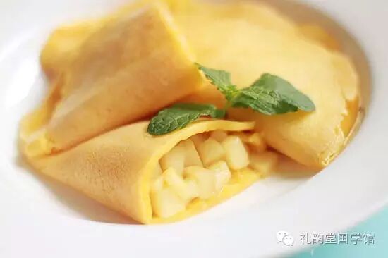 6.取适量先前炒好的苹果馅料,呈扇形的铺在煎饼四分之一的面积上(饼皮的边缘不要铺,以免折叠后漏出),然后将饼皮对折两次成扇形,再将其煎至两面金黄后即可出锅。