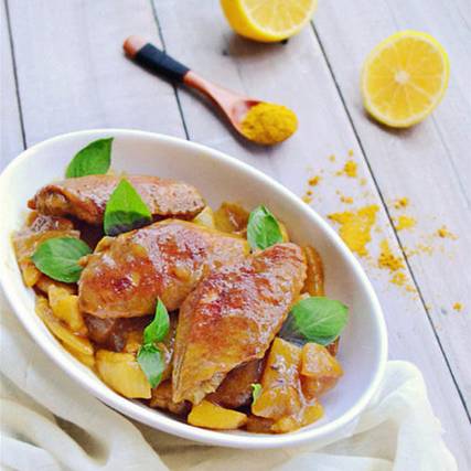 9、翻炒均匀至鸡肉上色后,慢火收汁至八成干时,加下入罗勒叶。