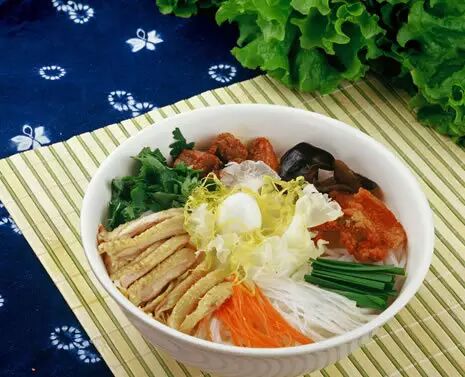 原 料: 鸡脯肉 、猪肚头、猪腰子、乌鱼肉、水发鱿鱼、油发鱼肚、火腿、香菜、葱头、净鸡块各20克 ,水发豆皮、白菜心、碗豆尖、葱、豆芽菜、蘑菇各50克,米线200克。
