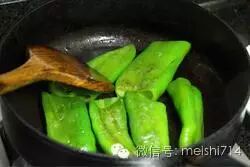 4.平底锅中放入油,中小火加至四五成热。将擦干水份的青椒放在锅中。需要不时翻面并用锅铲轻按青椒,使尖椒每面都能受热均匀煎成虎皮,盛出待用。