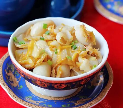 食材:鲍鱼6个、百合、食盐、姜、白酒、植物油、小葱