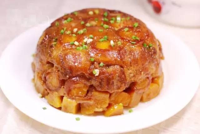 五花肉、红薯、珍珠米、葱、糖、生抽、醪糟汁、五香粉、盐。