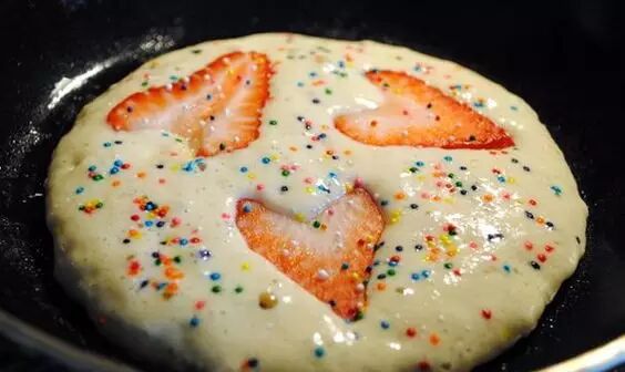 3、把提前切放好的草莓放到还未凝固的面糊上,撒上彩虹糖,小火煎至面糊凝固,翻面稍微的煎一下就可以出锅啦。
