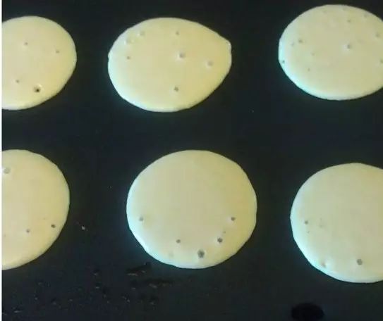 3、记住不用放油,用汤勺舀一勺面糊从高处慢慢倒在锅里,让面糊自己流成圆形。面饼表面开始起泡变硬时,用铲子翻看一下是否变黄,变黄即可翻面,再煎半分钟左右就好了。