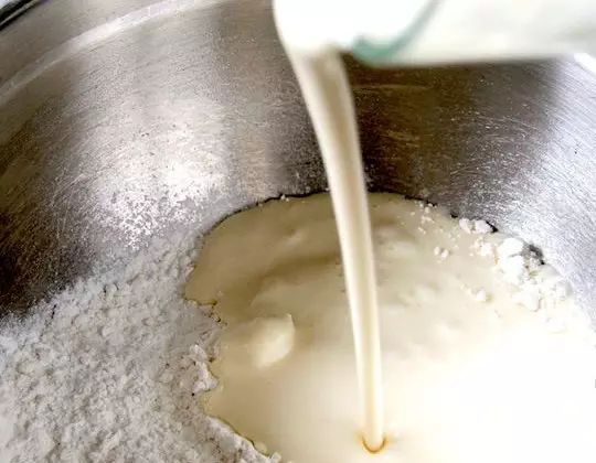 2、先将鸡蛋打碎,然后加入牛奶、奶油奶酪、黄油、柠檬汁、松饼粉搅拌均匀。