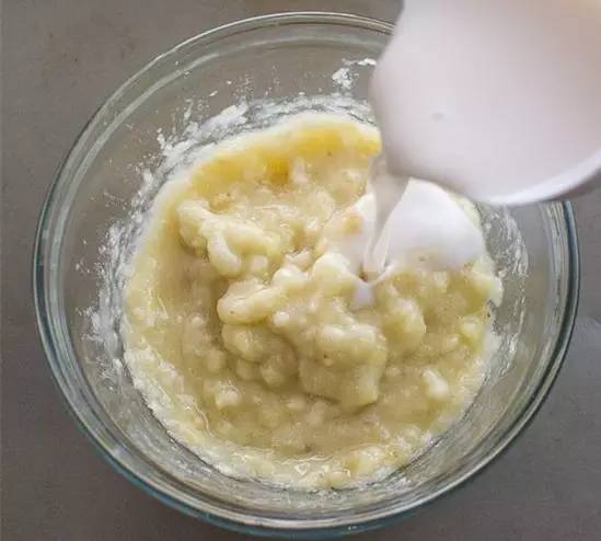 1、用勺子把香蕉碾碎,鸡蛋打成蛋液,加入面粉、牛奶和砂糖。