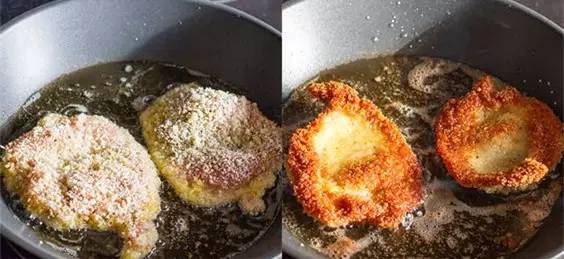 3、锅烧热以后倒入调和油,可以多倒一些,将裹好粉的培根片放入锅内,要勤翻面,以免糊锅。等培根变色,外层变红就熟了。