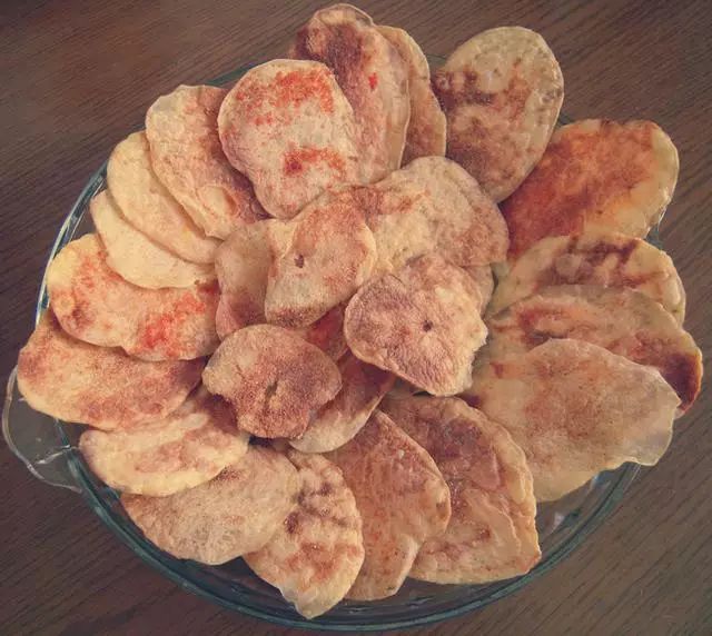 2、土豆片擦干,摆在微波炉专用的玻璃盘里,撒一点点料,放到微波炉里,高火,六七分钟左右,最好每隔两三分钟就要翻一次面,三次左右就好了。