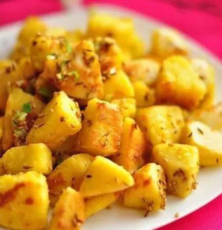 4.起锅热油,把馒头丁和孜然下入翻炒;